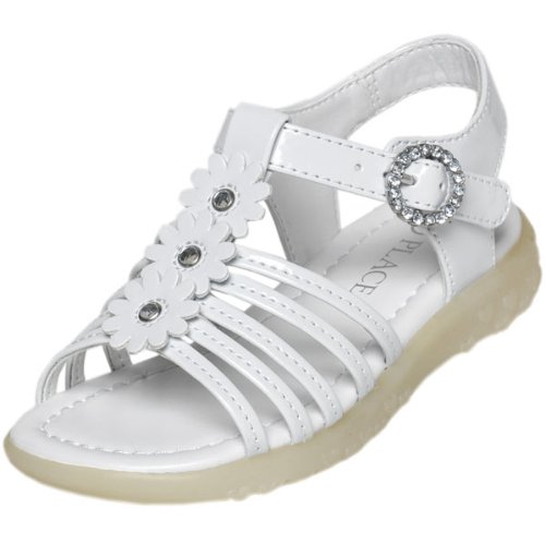 So sweet and pretty, she will wear them everywhere! Made of faux-patent leather. Adjustable ankle strap fastens with a rhinestone-studded buckle closure for a just-right fit . Faux-leather footbed is cushioned for comfort. Non-marking resin rubber outsole is textured for sure-footed steps . Sparkling rhinestones and pieced flowers finish the look. Imported.